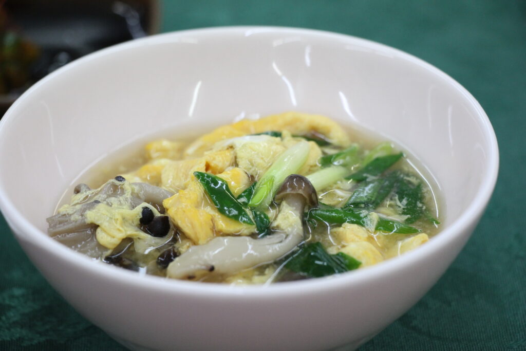 中華風卵のスープ(木樨湯ムーシータン)スープに溶き卵が美しい。とろみがあるので、からだの芯まで温まります。