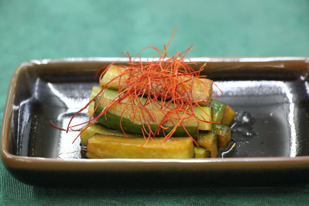 きゅうりの甘酢漬け(辣椒黄瓜ラージャオフォアンカー)唐辛子の辛さが刺激的。サッパリとお口直し。