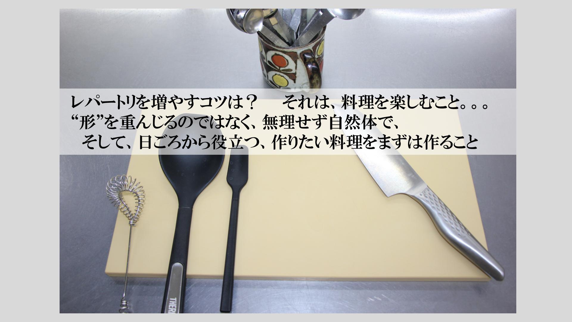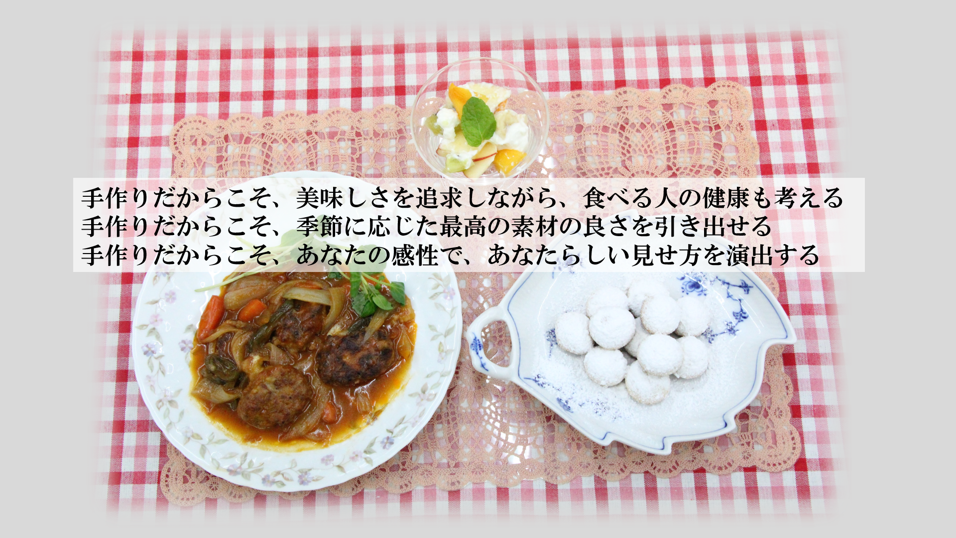 旬の食材を大切にして、和食、中華、洋料理を満遍なく作ります。毎回3品で、皆様が楽しみにしていらっしゃる季節のお菓子が入る時もあります。